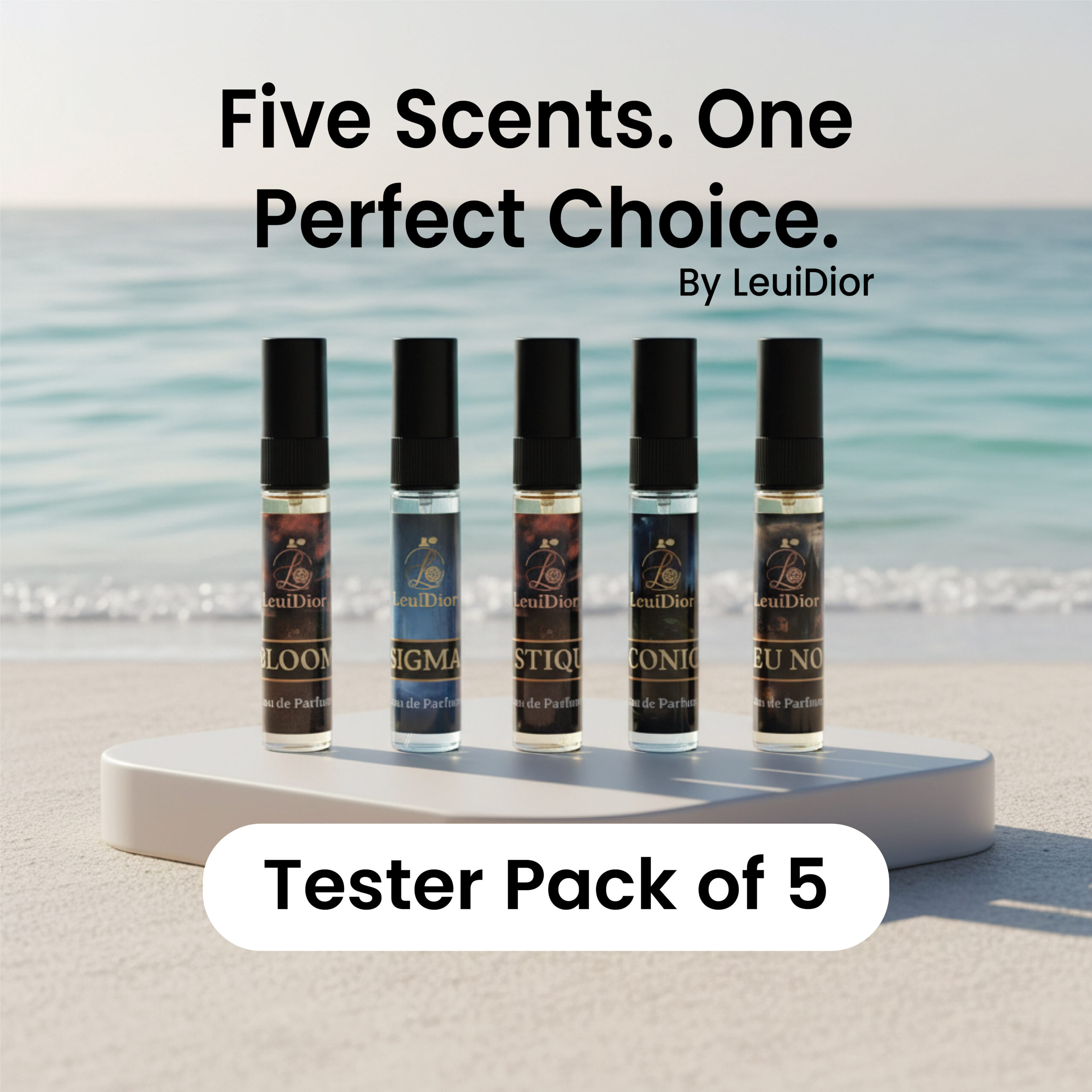Discover the essence of elegance, confidence, and charm with our Tester Pack of 5. This curated set of 5ml testers lets you explore a variety of premium fragrances, perfect for trying new scents, gifting, or carrying your favorites on the go. Designed for both men and women, each fragrance offers a unique experience that reflects personality, style, and sophistication.
